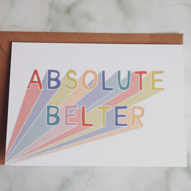 Artwork by a 'messy haired Scottish lass', this card features a bold and colourful design, the words 'Absolute Belter' in large print.