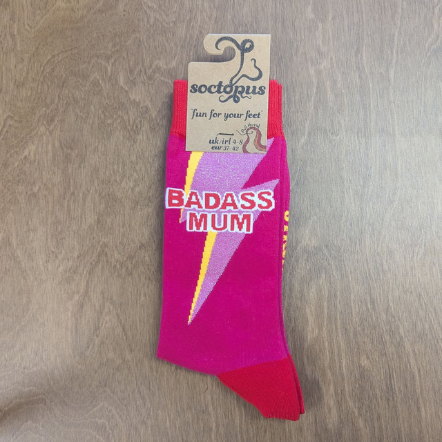 Bright pink with red trim and a Badass Mum Superhero logo, these socks are machine washable and feel comfortingly soft!