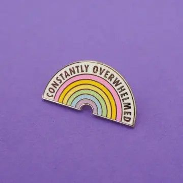 Beautifully designed enamel pin with 'Constantly Overwhelmed' pastel rainbow logo.