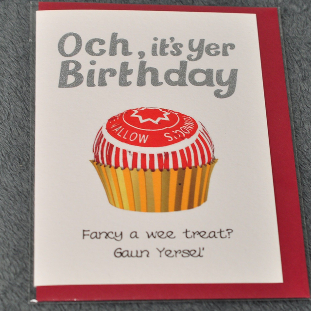 Printed with the words 'Och, it's yer Birthday' and 'Fancy a wee treat? Guan yersel'', it has a picture of a red and white wrapped teacake.