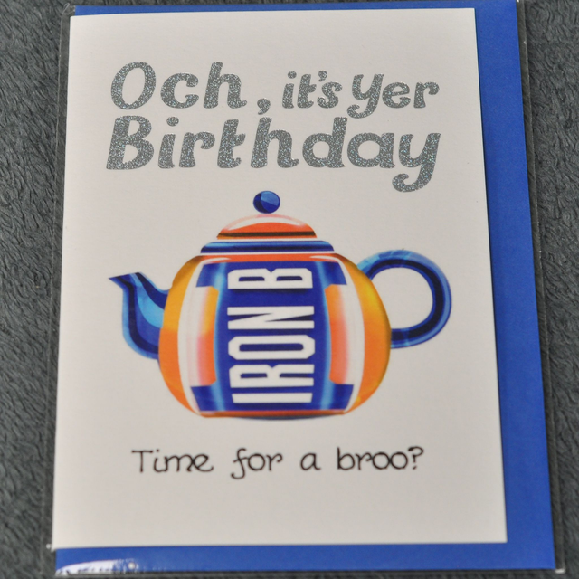 Printed with the words 'Och, it's yer Birthday' and 'Time for a broo?'', it has a picture of an orange and blue teapot with the words Iron B' on it.