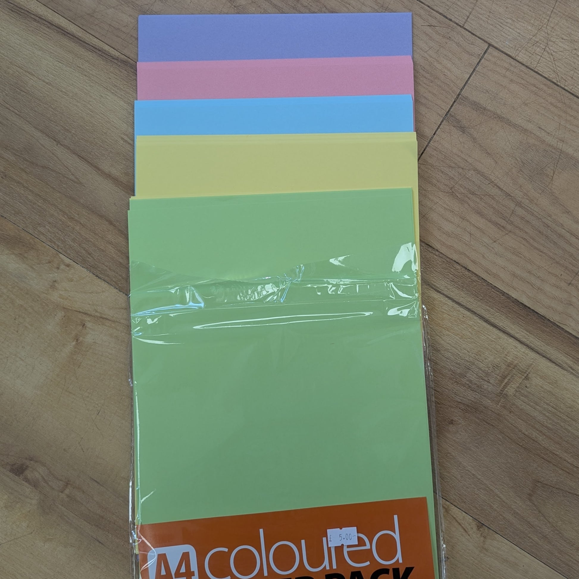 125 sheets of 80gsm bright coloured premium paper.; 25 sheets each of light green, yellow, light blue, pink and lilac,