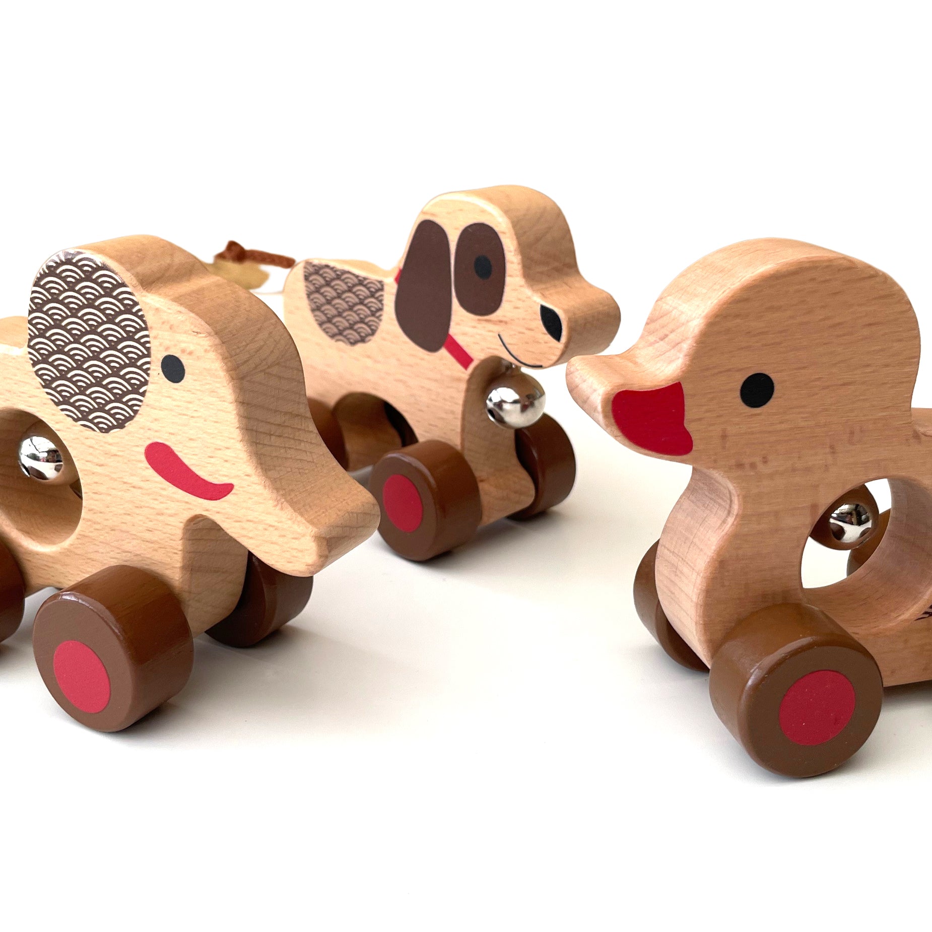 Children will love playing with these push along animal toys and they will help them to get mobile! Three beautiful wooden rolling resources complete with silver bells in a variety of animal designs.