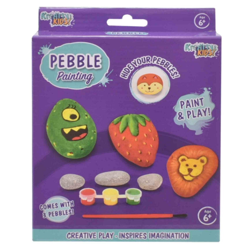 Create and decorate pebbles, includes 3 pebbles, 3 different paints and a paintbrush.